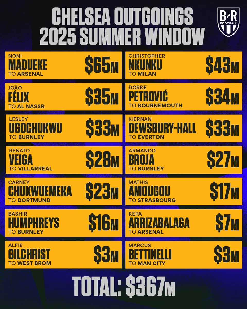 上赛季末接连获得欧协联与世俱杯两个冠军的切尔西在夏窗动作频频,而除了买人之外,切尔西也通过出售14名球员获得了总共3.67亿美元的收入。