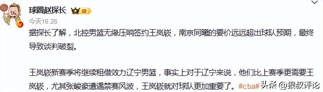 同样是状元签的王岚嵚有消息称,同曦一直要求转会费是3000万元,但北控最终给到的价格是2000万元,最终不欢而散。