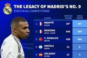 德转盘点皇马9号球员:大罗、C罗、本泽马、姆巴佩在列